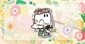 フリージアで作った花飾りの花びらが舞い、おばけの足元の布もパタパタとはためいています。