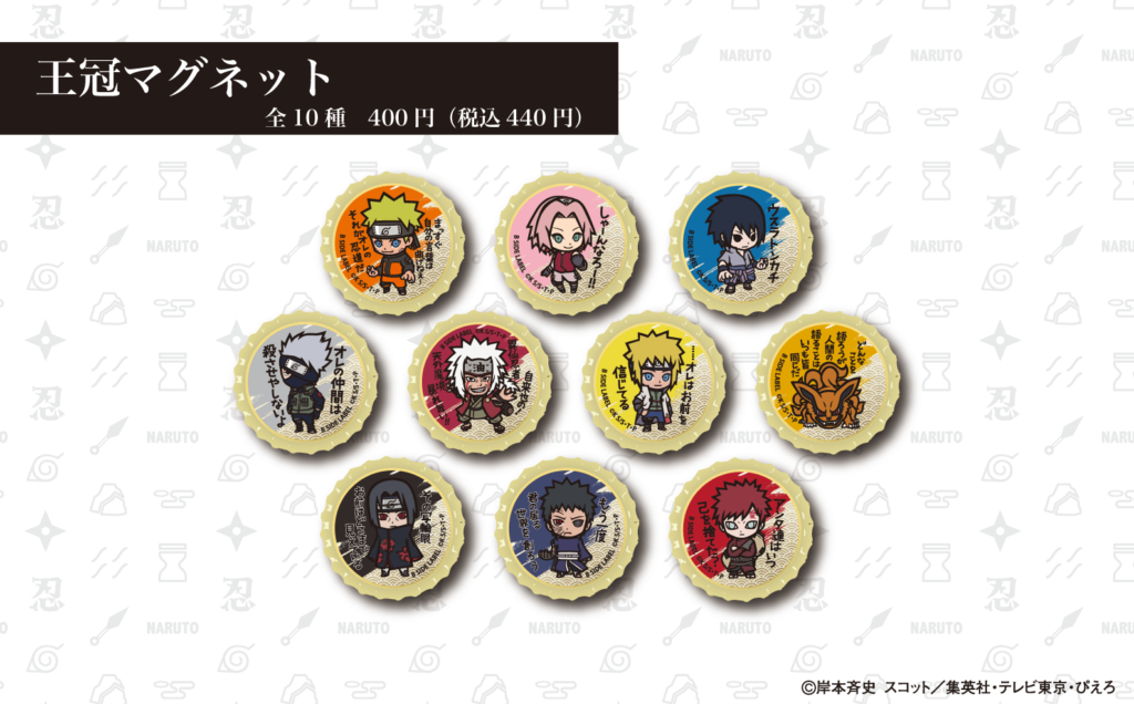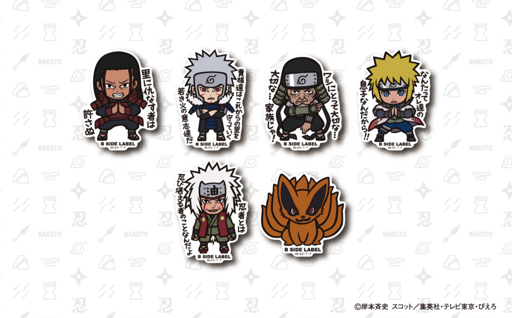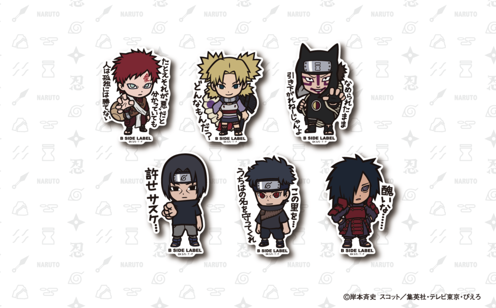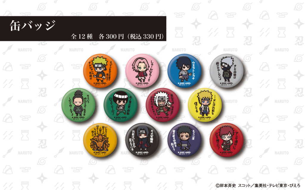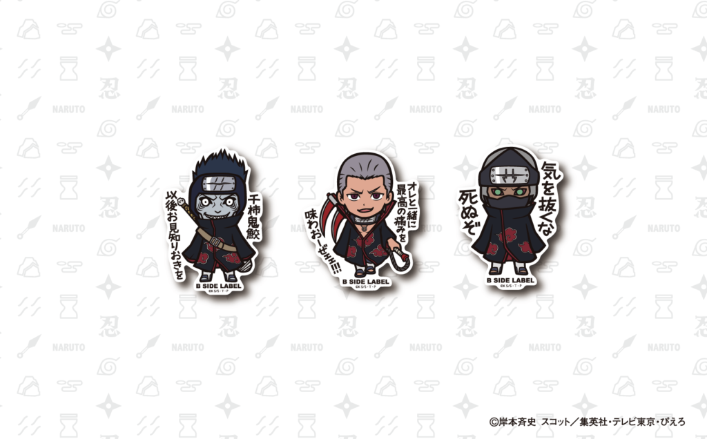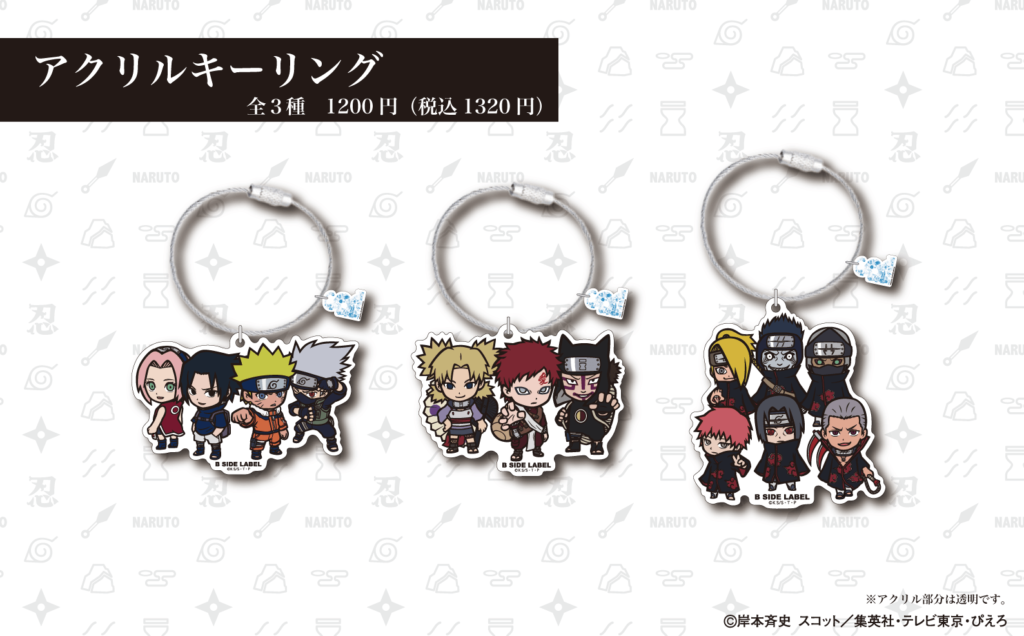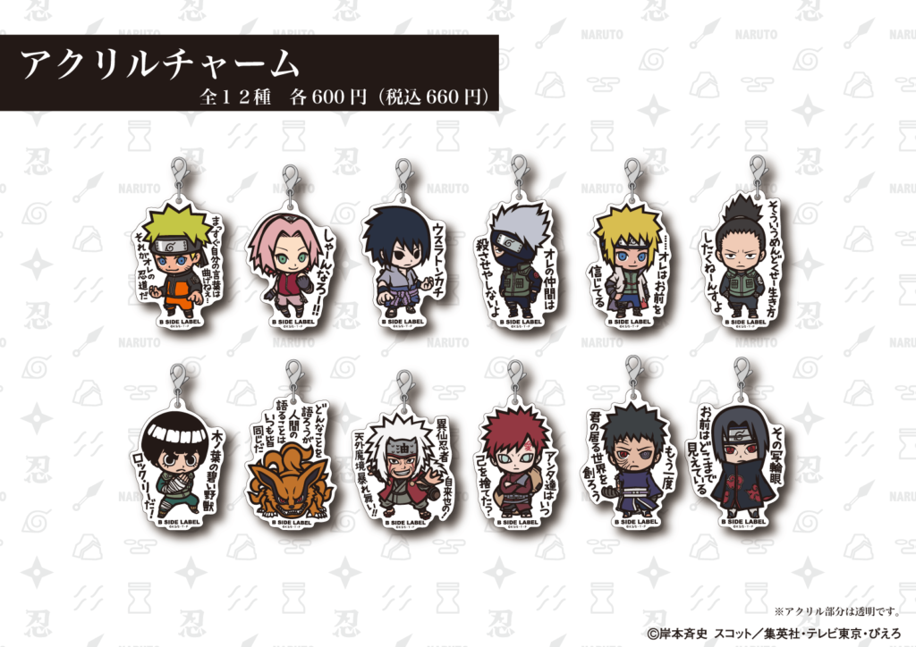 「NARUTO-ナルト-」シリーズステッカー&雑貨アイテム ・ステッカー 全24種 各300円(税込330円 ) ・缶バッジ 全12種 各300円(税込330円 ) ・アクリルチャーム 全12種 各600円(税込660円 ) ・アクリルキーリング 全3種 各1,200円(税込1,320円 ) ・王冠マグネット 全10種 各400円(税込440円 ) ・PVCケース 全1種 1,800円(税込1,980円 ) ・パスケース 全5種 各2,000円(税込2,200円 ) ・ラバーキーケース 全4種 各1,000円(税込1,100円 ) ・トートバッグ 全2種 各1,800円(税込1,980円 ) ・スクエアポーチ 全2種 各1,800円(税込1,980円 ) ・ファスナーポーチ 全1種 1,500円(税込1,650円 ) ・Tシャツ 全2種 各4,500円(税込4,950円 ) 発売日 2025年 8月8日 取扱店舗: ・B-SIDE LABEL直営店 ・WEB SHOP 当日の12:00より販売開始 ※B-SIDE LABEL商品取扱販売店 順次展開予定
