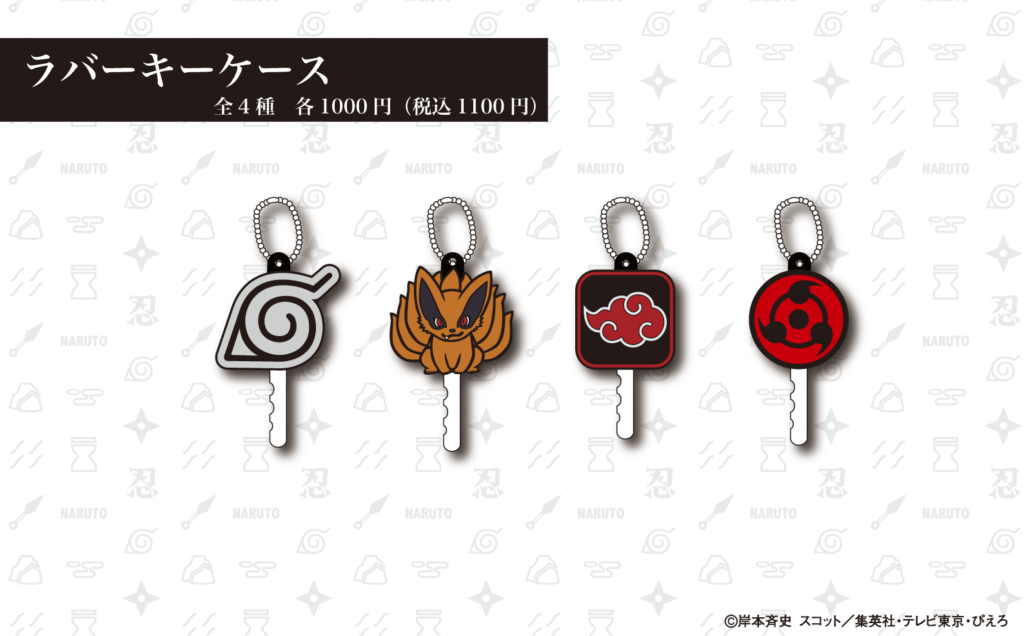 ラバーキーケースは木ノ葉マーク、写輪眼、“暁”のマーク、九喇嘛の4種類。大切な鍵もお気に入りのモチーフやキャラクター印に。