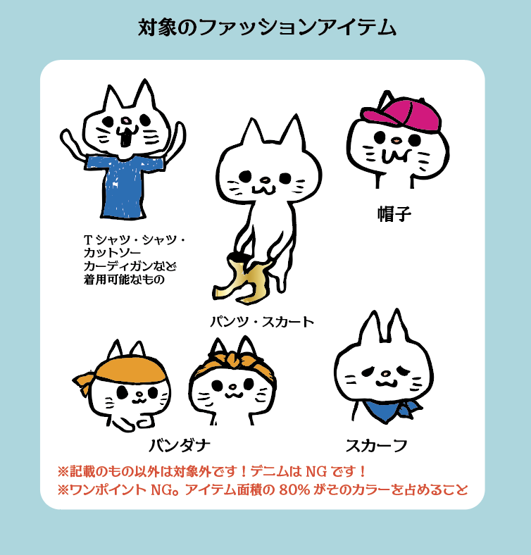 ※アイテム全体のお題カラーが80%以上を締めていること。ワンポイントはNG。