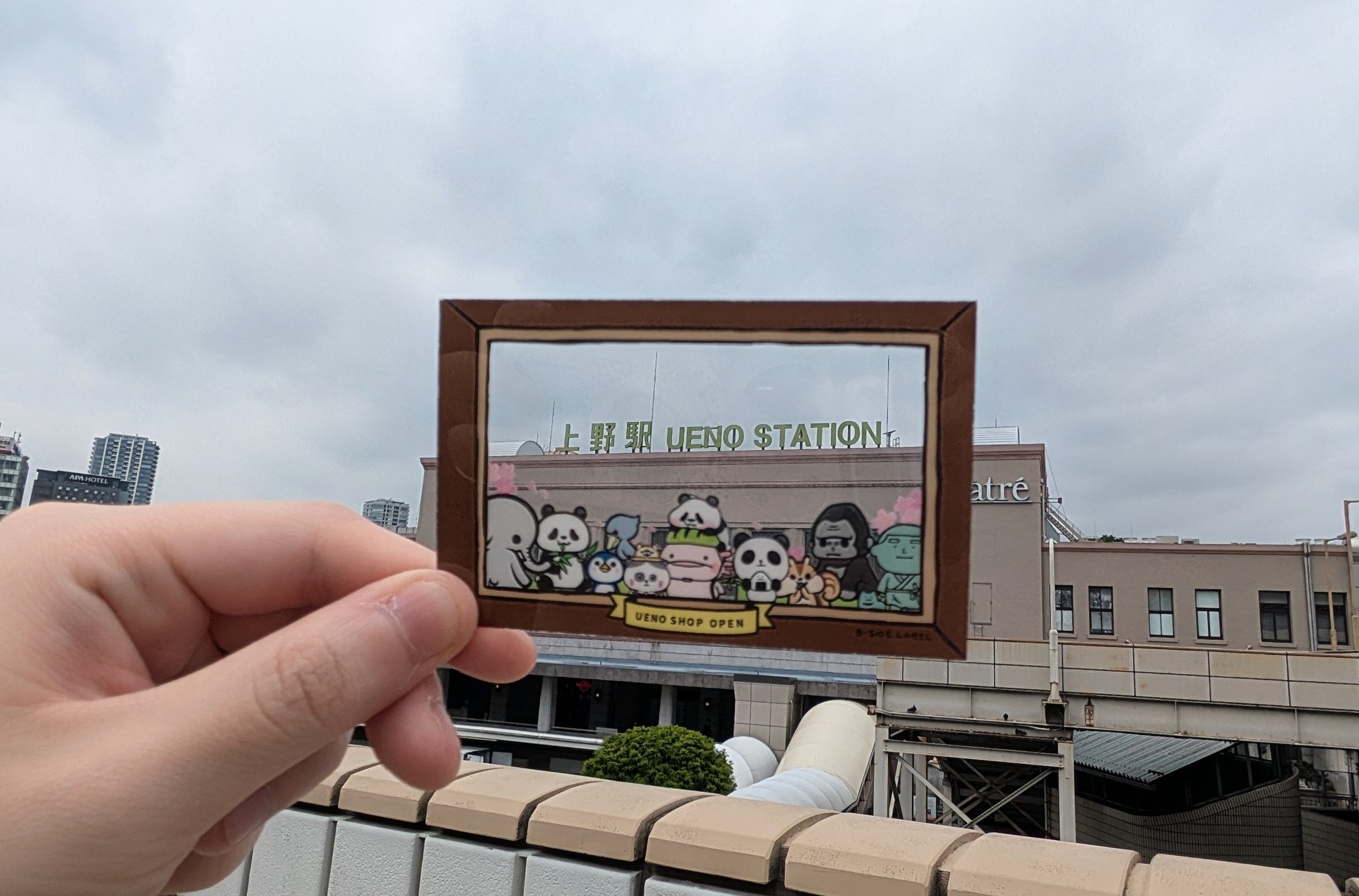 ▲上野店OPEN記念にお配りしたクリアカードを使って、駅を背景にパシャリ!上手く画角に入れてくださいました♪
