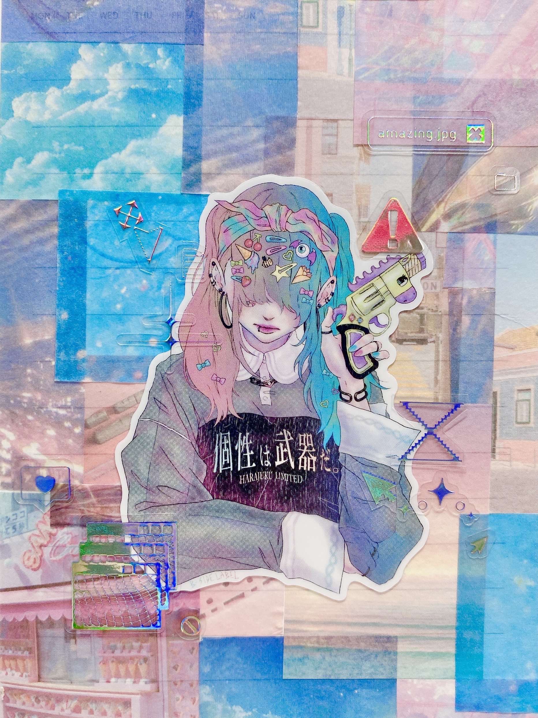 ▲こちらも背景とステッカーの相性がピッタリ合っており、一枚の絵のような仕上がりに♪原宿店限定ステッカーを主役にコラージュしてくださいました!