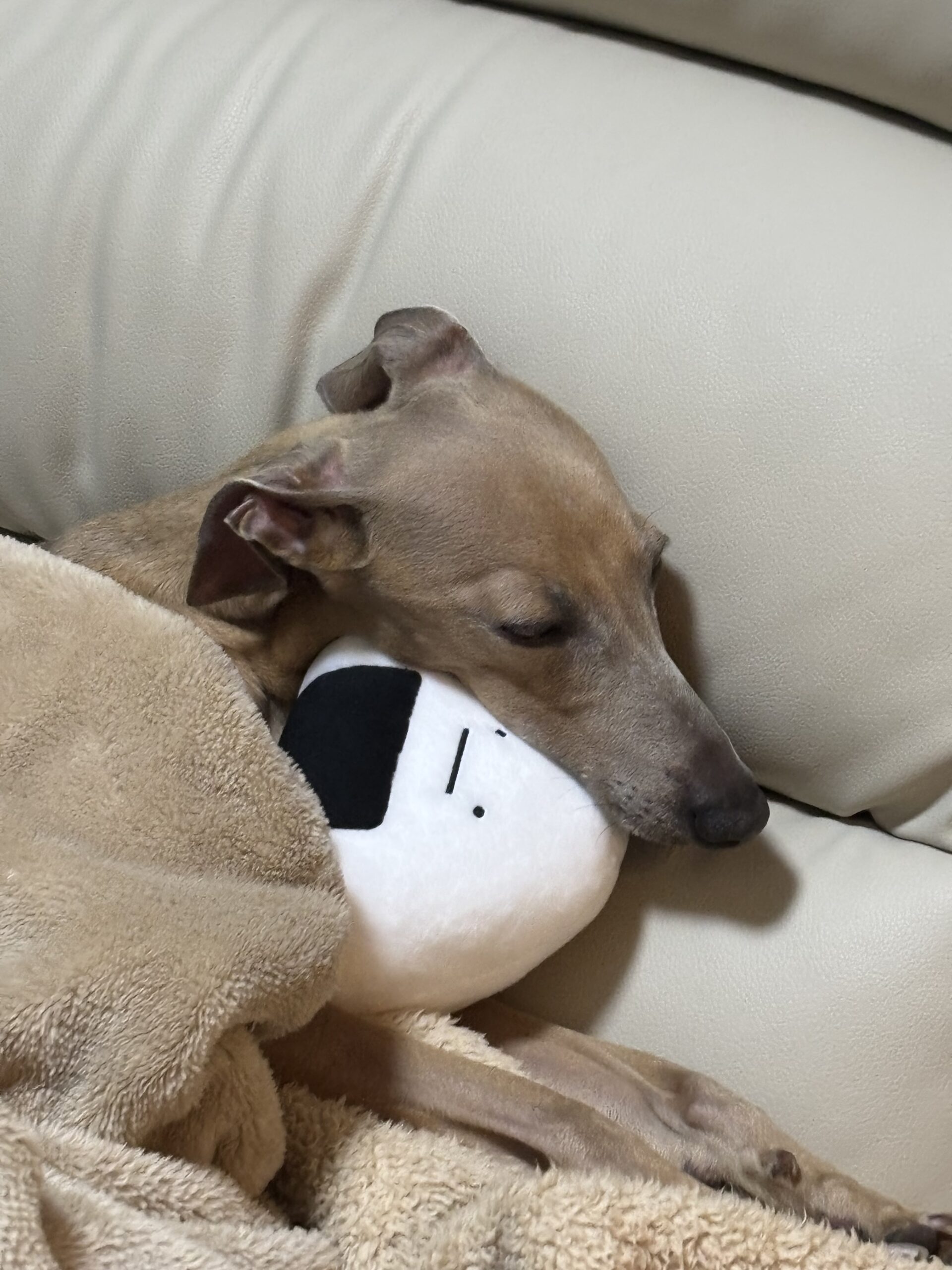 ▲まがおおにぎりがわんちゃんお気に入りの枕になっちゃいました♪リラックスした姿が可愛すぎます!