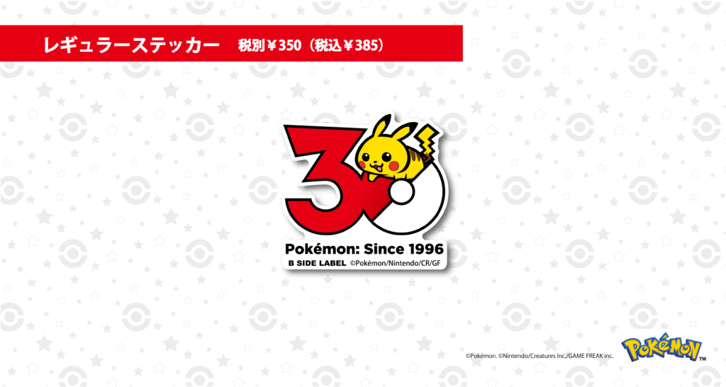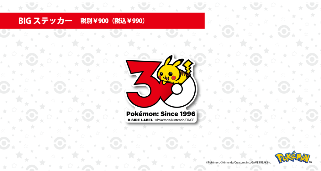 B-SIDE LABEL ポケモン30周年ステッカー 2026年3月13日発売 レギュラーステッカー 各税別 ¥350 (税込 ¥385 ) BIGステッカー 各税別 ¥900 (税込 ¥990 ) ・B-SIDE LABEL 直営店 ・B-SIDE LABEL WEB SHOP ※B-SIDE LABEL商品取扱販売店 順次展開予定