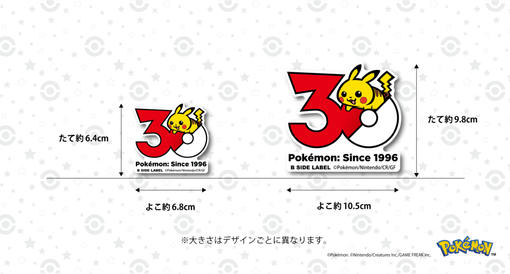 ポケモン30周年の記念ロゴからB-SIDEデザインのピカチュウが飛び出したステッカーデザインとなっています。