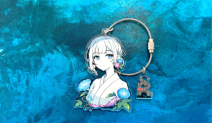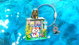 ▲バスを待つおいなりさんと黒糖さん、浴衣姿の女の子のキーリング。