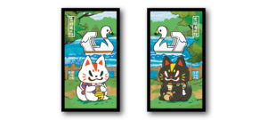 ▲公園で仲良くくつろぐおいなりさんと黒糖さんの姿が描かれています。