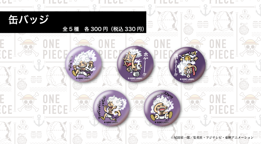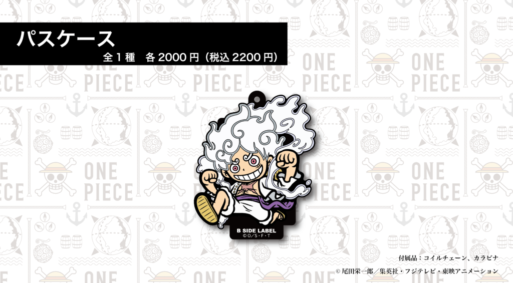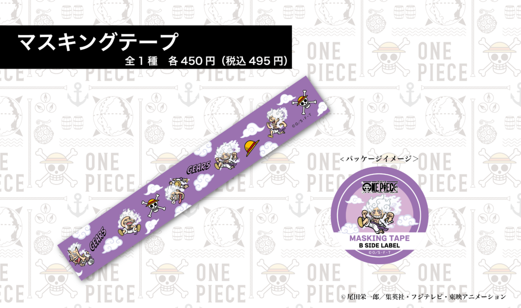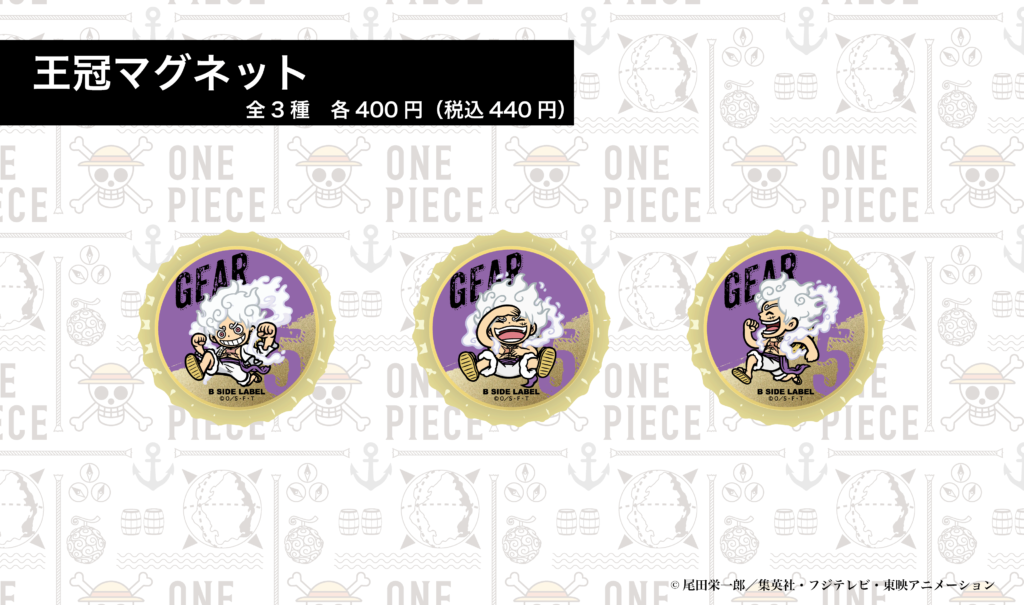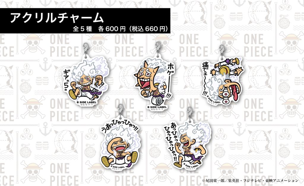 TVアニメ『ONE PIECE』“ギア5”雑貨アイテム ・缶バッジ 全5種 各300円(税込330円 ) ・アクリルチャーム 全5種 各600円(税込660円 ) ・王冠マグネット 全3種 各400円(税込440円 ) ・マスキングテープ 全1種 450円(税込495円 ) ・PVCケース 全1種 1,800円(税込1,980円 ) ・パスケース 全1種 2,000円(税込2,200円 ) ・トートバッグ 全1種 1,800円(税込1,980円 ) ・スクエアポーチ 全1種 1,800円(税込1,980円 ) ・ファスナーポーチ 全1種 1,500円(税込1,650円 ) 2025年12月5日発売予定 ・B-SIDE LABEL直営店 ・B-SIDE LABEL WEB SHOP(発売日の正午12時より販売) ※ほかB-SIDE LABEL取扱い販売店様 順次展開予定