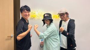 ▲左からFM802のDJ飯室大吾さん、デザイナーくずもちルー、里本直紀。