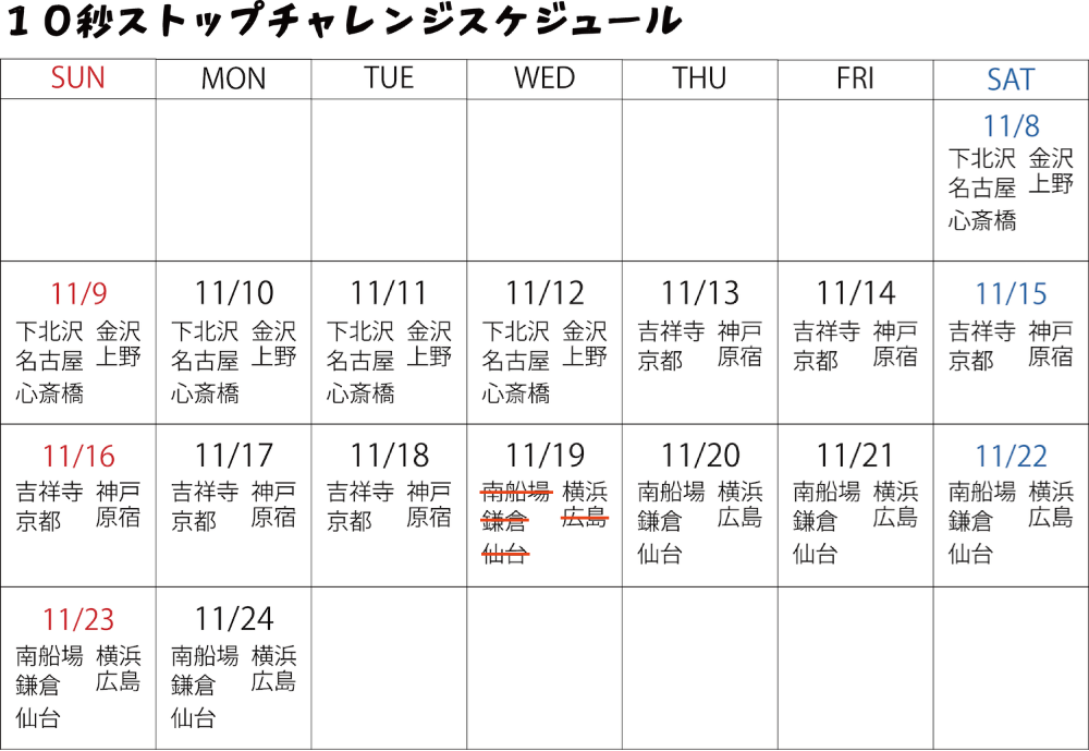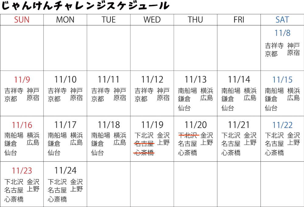 ※定休日の関係により、一部スケジュール(11/12,11/19/,11/20)に変更がございます。ご利用を予定されていた皆さまには、ご不便をおかけし誠に申し訳ございません。恐れ入りますが、あらためて日程をご確認くださいますようお願いいたします。変更後のスケジュールは、各チャレンジのカレンダーよりご確認いただけます。