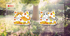 色とりどりの落ち葉と戯れるネコちゃん。