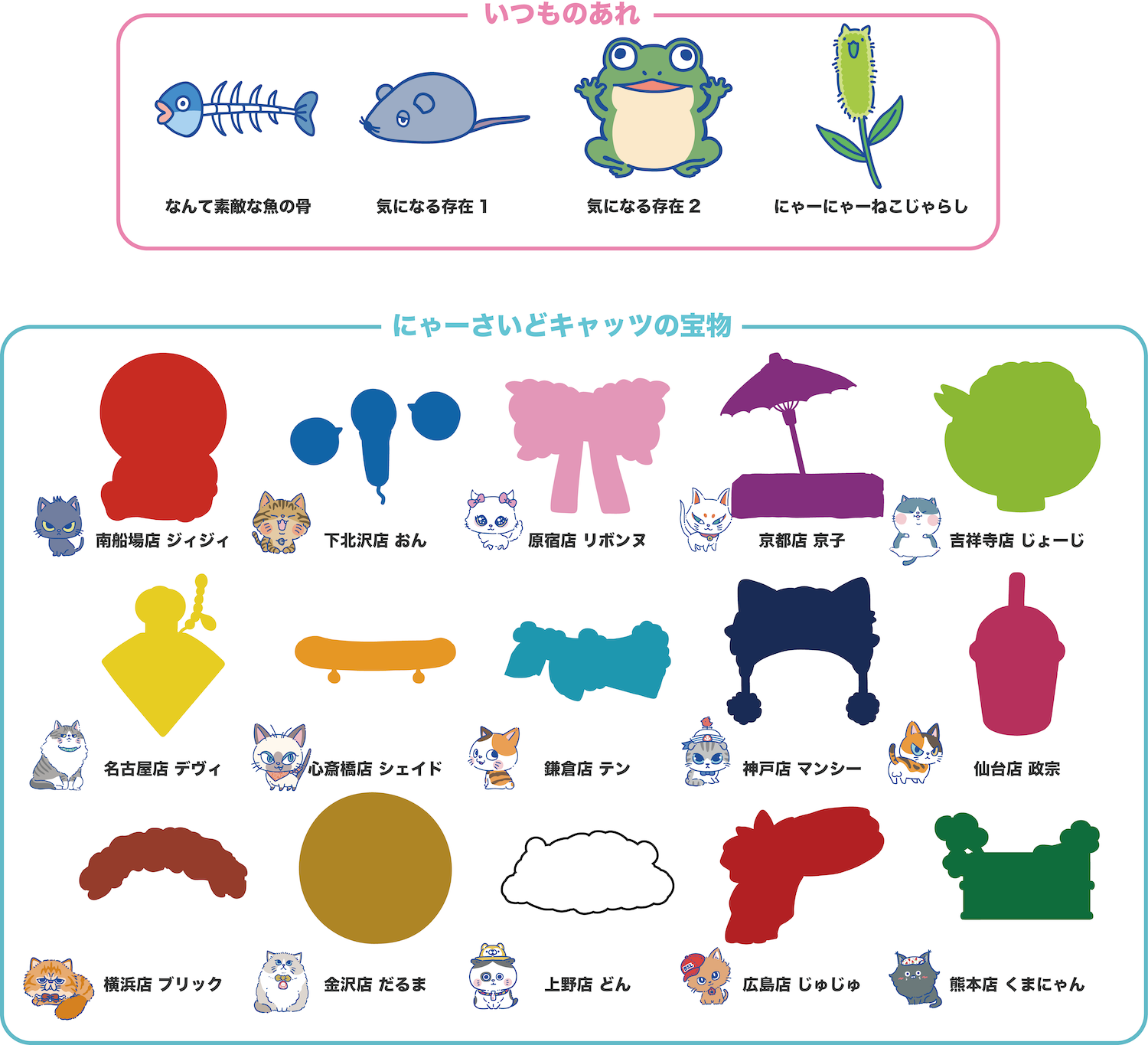 なんと、全店舗のキャッツたちが一斉に自分の店舗のどこかに「宝物」置き忘れちゃったみたいです。人間の私もビックリ。