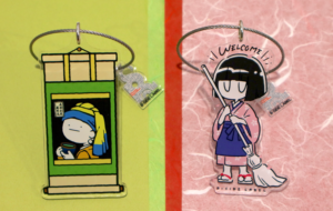 ▲まがおの掛け軸と女の子のキーリング。