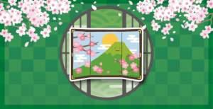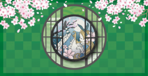 桜と満月の幻想的な風景を、茶室の丸窓が美しく切り取っています。
