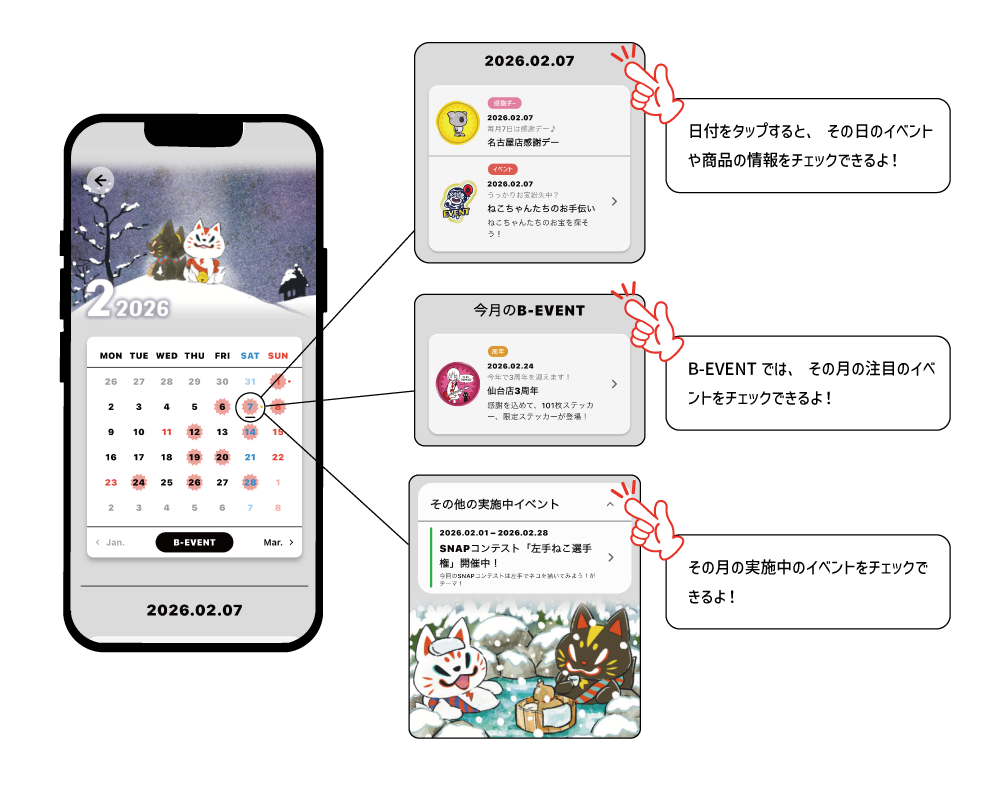 あんな情報、こんな情報。 毎日アップされるニュースに、 気になるグッズ、イベント情報…。 情報が多くて迷ってしまう… そんな声にお応えして、新機能が登場! カレンダーの日付をタップするだけで、 その日に登場するグッズや、開催中のイベントが一気にチェックできちゃいます!