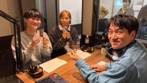 ▲左からすばる、もこな、FM802のDJ飯室大吾さん。